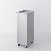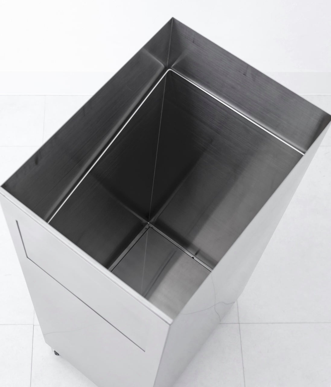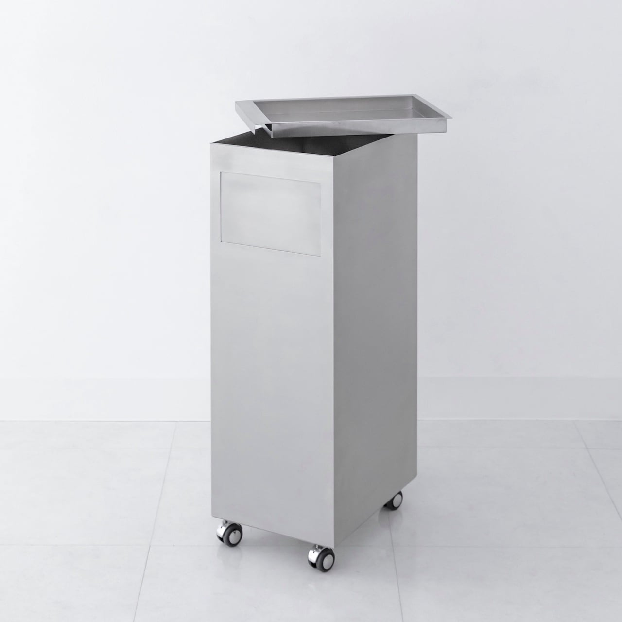 . The casters allow for smooth movement when attaching or removing trash bags. A hinged lid is also available instead of a tray. Custom sizes are also available to fit your space, down to the millimeter.