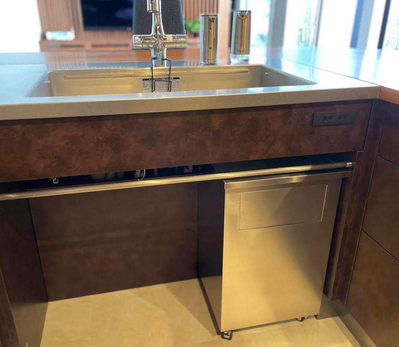 This large-capacity, front-loading stainless steel trash can can be installed in a cupboard or under a shelf.